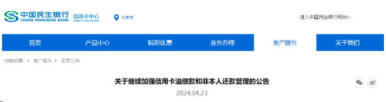 4月23日,中国民生银行信用卡中心发布了“关于继续加强信用卡溢缴款和非本人还款管理的公告”。