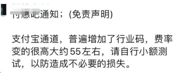 支付宝普遍增加了大额行业码,费率涨了0.55左右,请自行小额测试,以防造成不必要的损失。