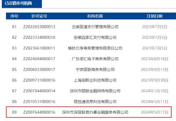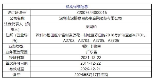 支付牌照被正式注销:深圳市深银联易办事金融服务有限公司