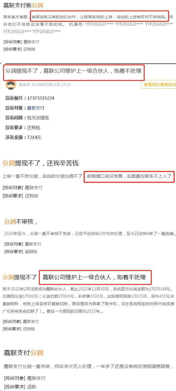 随即小编在某知名投诉网站搜索了嘉联支付有关分润的投诉,果然不少。嘉联支付的一级以下代理商分润提现,需要经过上级代理审核同意方能到账,只要上级不审核处理,你的分润就永远别想到账。即便代理向嘉联总部投诉也无用,上级哪天不开心了、缺钱了,不想给下级分润了,就可以不审核放款,大家觉得这样合理吗?下图为一些投诉案例,分润少则几百,多则数万元迟迟无法到账。