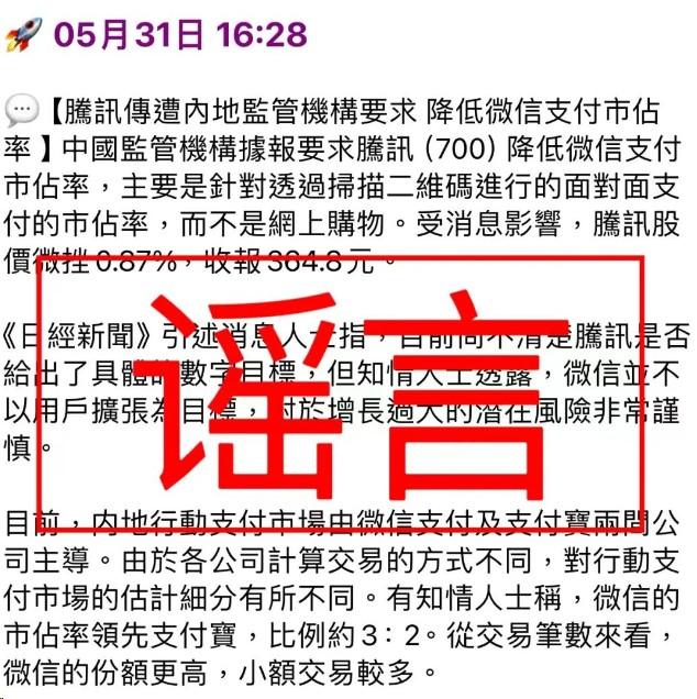 当日晚间,腾讯通过微信官方辟谣平台回应微信支付被要求降低市场份额的传闻,“经确认,相关传闻不实,纯属谣言。”