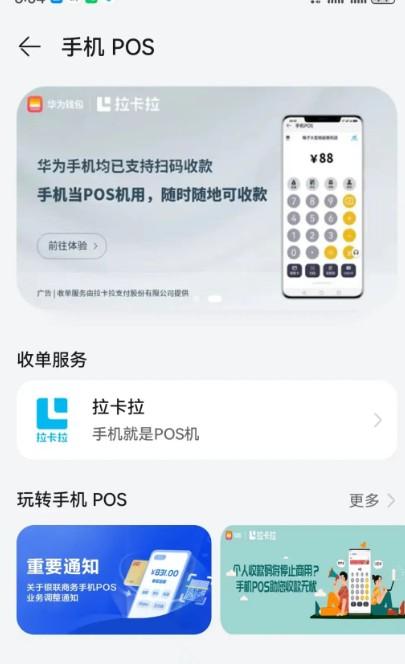 值得指出的是,有报道误解此通知为华为下线了手机POS业务,其实并非如此。目前华为钱包App显示手机POS业务的收单服务机构为拉卡拉公司。