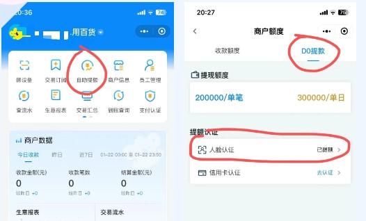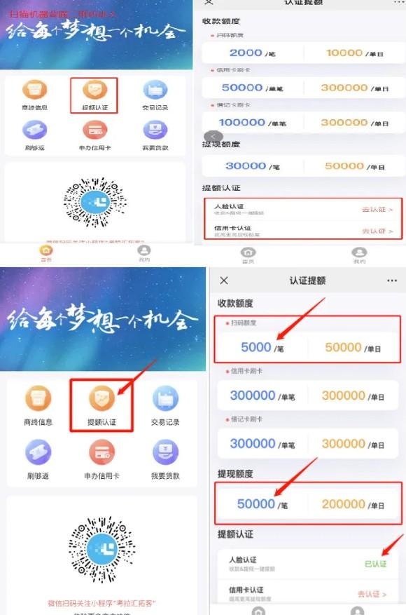 (1)支付宝扫一扫,扫描机器背后二维码,输入身份证后6位,选择提额认证—人脸认证即可,(做完人脸认证,单笔秒到5万,一天秒到20万,如果不够,可以再认证一张本人信用卡,每天秒到额度上涨到30万),营业执照用户可不用。