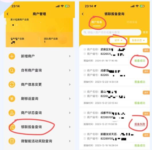 好拓客APP—我的业务—商户管理—银联报备查询(商户报备—进件)