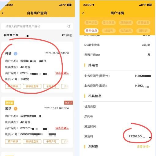 提交资料后,一般会自动返回到商户详情页面,【商户管理】—【自有商户查询】,商户显示“开通”,即审核通过。点一下商户信息,就会进入商户详情页面,再下滑到最底部,即可看到商户激活码。