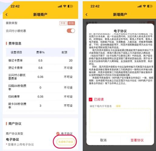 第三步:确认费率(无法修改),同意并签署商户电子协议提交审核,签名尽量正楷,提交后等待审核通过,一般都是秒审核。