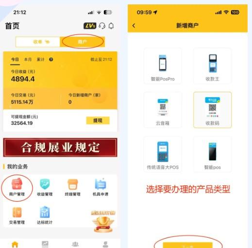 2、收款码、云音箱、智能POS机、智能POSPro等真实商户产品入网,首页最上面需选择【商户】选项,APP中间直【我的业务】一栏,接选择【商户管理】—【新增商户】——选择相应的产品类型,进行资料填写。