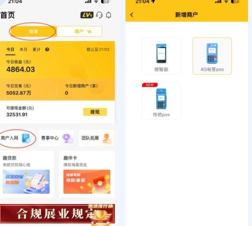 1、电签、微智能、出票大POS机入网,首页最上面默认为【收单】选项,APP中间直接选择【商户入网】,或者选择【商户管理】—【新增商户】——选择相应的产品类型,进行资料填写。