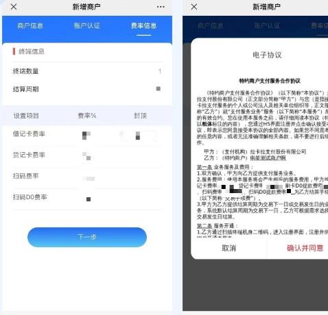 第三步:确认费率(无法修改),同意并签署商户电子协议提交审核,签名尽量正楷,提交后等待审核通过,一般都是秒审核。