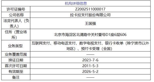 拉卡拉成立于2005年,于2011年获得《支付业务许可证》,目前拥有全国性的互联网支付、移动电话支付、数字电话支付、预付卡受理业务及除宁波市以外的全国性银行卡收单业务资质,是国内领先的第三方支付公司,公司定位为“商户数字化经营服务商”。2011年首批获得中国人民银行颁发的《支付业务许可证》。2019年4月25日,拉卡拉支付在深交所成功上市,成为第一家登陆A股市场的第三方支付企业,股票代码300773。