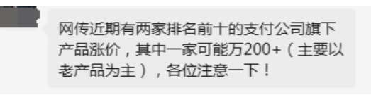 另外有业内人士透漏,近期可能还会有两家排名前十的支付公司旗下产品要涨价,其中一家可能涨至万200以上!