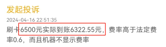 还有POS机涨价到万200以上的机器,其他用户爆料,有人刷6500,到账6322.55,扣了177.45,费率相当于万270+3元/笔,也是天花板的级别。