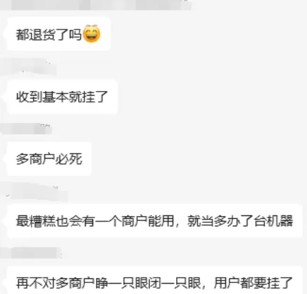 群内也有代理商表示,多商户必死,客户收到机器基本就挂了。