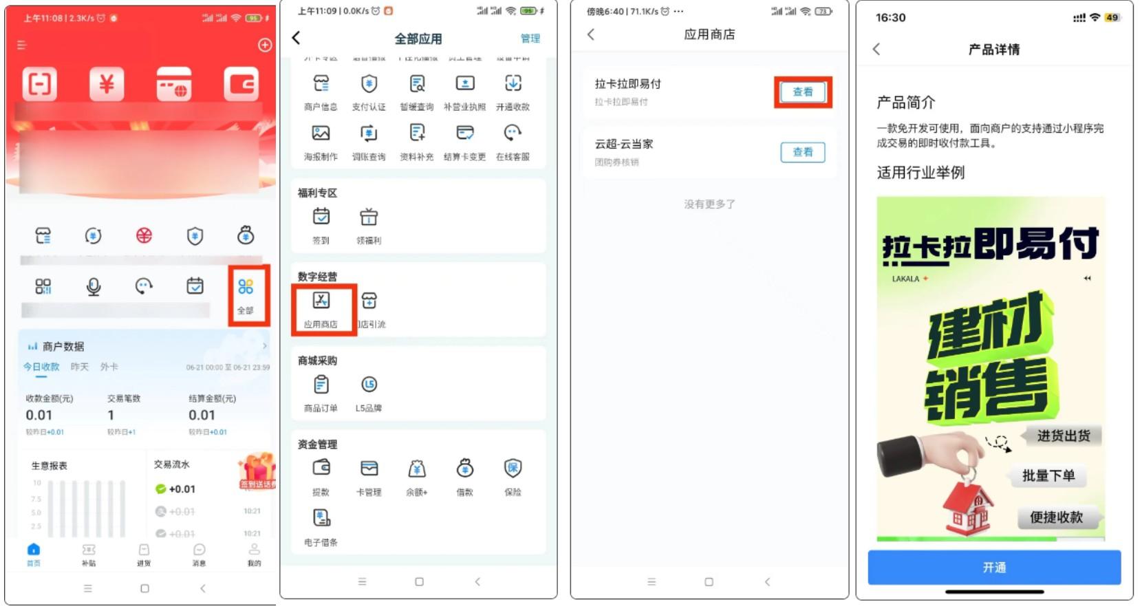【拉卡拉钱包App首页-全部-数字经营-应用商店-跳转拉卡拉即易付小程序】