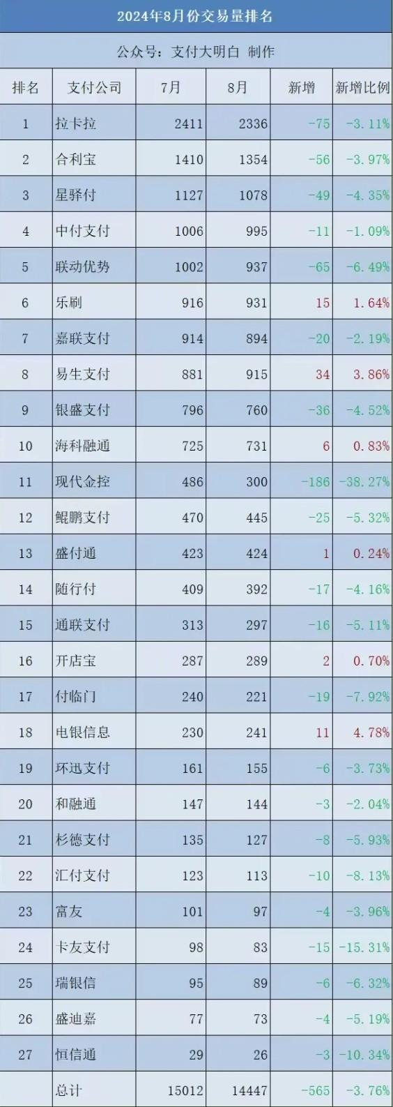 最近,10月份各支付公司交易量排名公布,跟9月份相比,稳中有升,10月份有6家支付公司交易量过1000亿,分别是:拉卡拉、合利宝、国通、中付、易生、乐刷,比9月份多了2家。