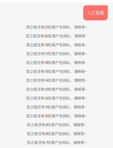 第二步:进入以后输入“人工客服”,如果没有进入排队页面,就再输入一次,直到进入如下排队界面。(预计排队2-5分钟)