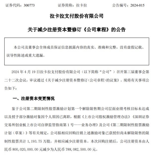 事实上,拉卡拉本次减资,背后与部分限制性股票的回购注销有所关联。