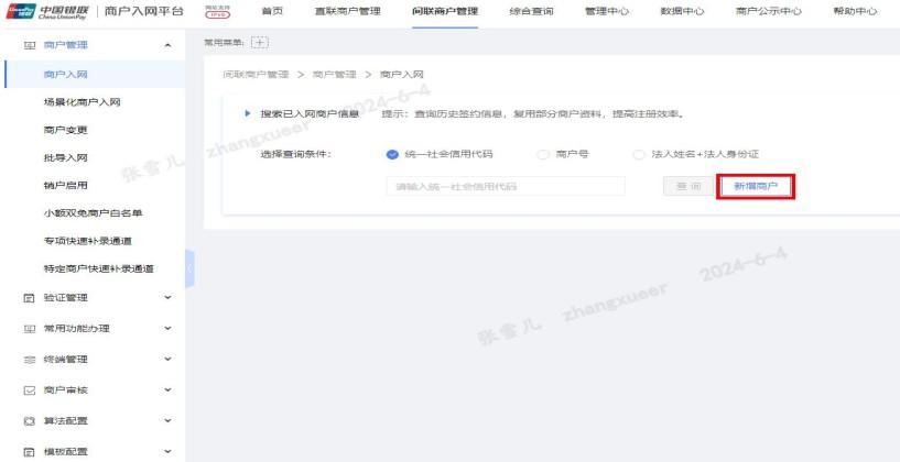 点击“间联商户管理”-“商户管理”-“商户入网”进入商户录入页面;点击“新增商户”,开始录入一个全新的商户。
