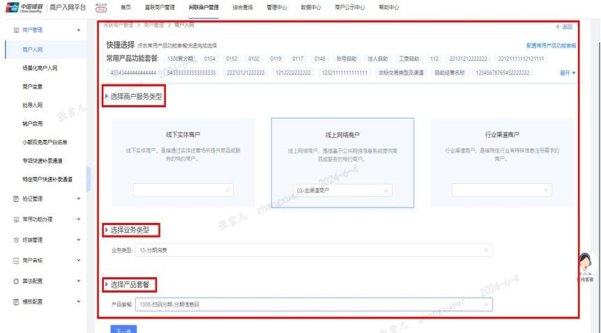 选择“新增商户”后,出现一个页面,此处选择“线上网络商户”,并对商户服务类型、业务类型、产品功能套餐选择如下相应取值: