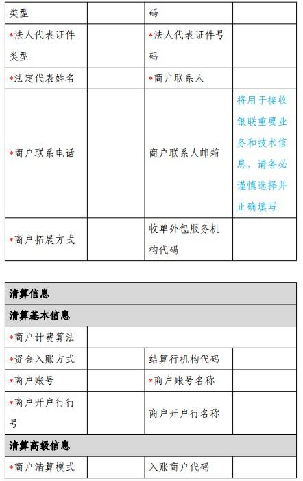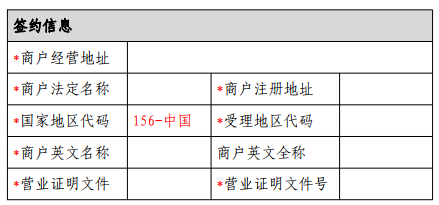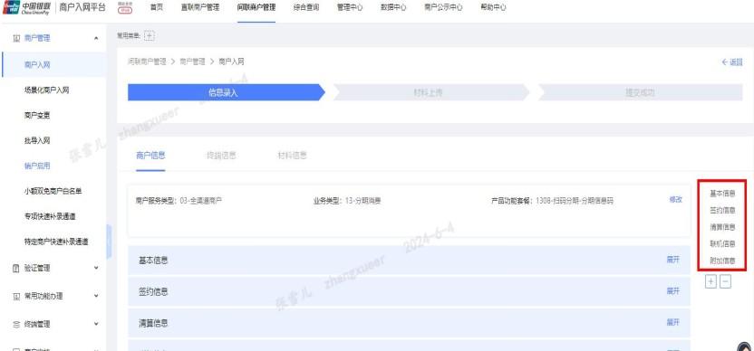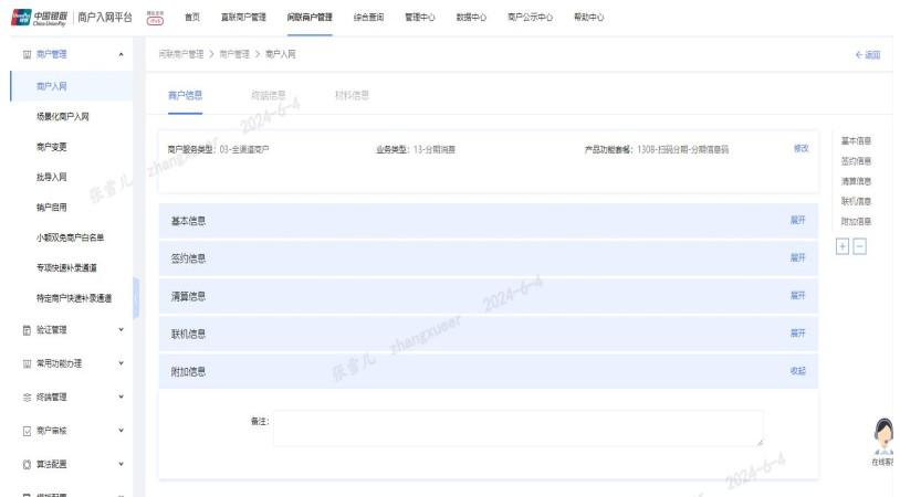 完成商户服务类型、业务类型、产品功能套餐选择后,出现“商户信息”录入页面,共涉及基本信息、签约信息、清算信息、联机信息、附加信息5部分