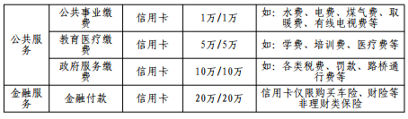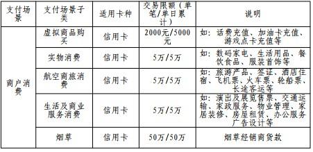 消费业务场景范围及单卡单笔/单卡日累计限额要求如下: