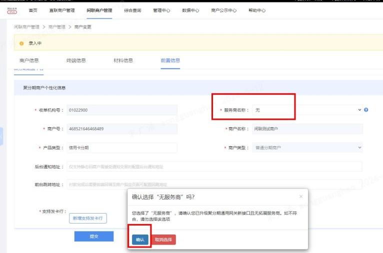 (3)如果在录入商户信息并点击提交审核后再点击“前置信息”进行聚分期信息录入,则属于存量商户修改。