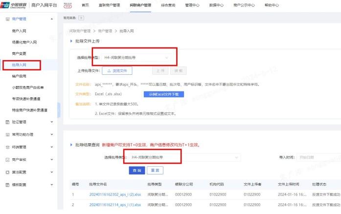 间联商户管理- 批导入网 - 选择批导类型:H4间联聚分