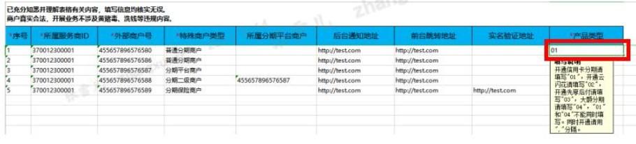 1、请根据实际情况填写外部商户号、特殊商户类型(默认填写普通分期商户)、后台通知地址等信息,产品类型默认写 01。