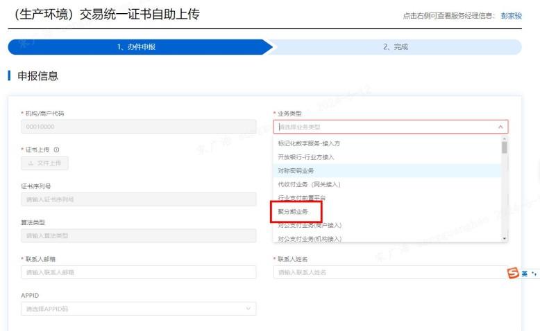 1、收单机构若使用存量证书,则通过(生产环境)交易统一证书自助上传入口操作:选择“(生产环境)交易统一证书自助上传”-“立即办理”。其中业务类型选择“聚分期