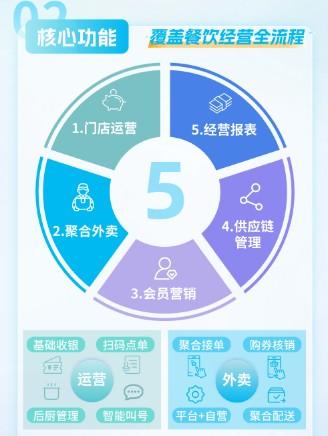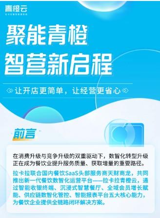 拉卡拉联合国内餐饮SaaS头部服务商天财商龙,共同推出新一代餐饮数智化运营平台一-拉卡拉青橙云,通过智能收银终端、沉浸式智慧餐厅、全域会员增长赋能、供应链数智化管控、智能报表平台五大核心能力,为餐饮企业提供全链路闭环解决方案。