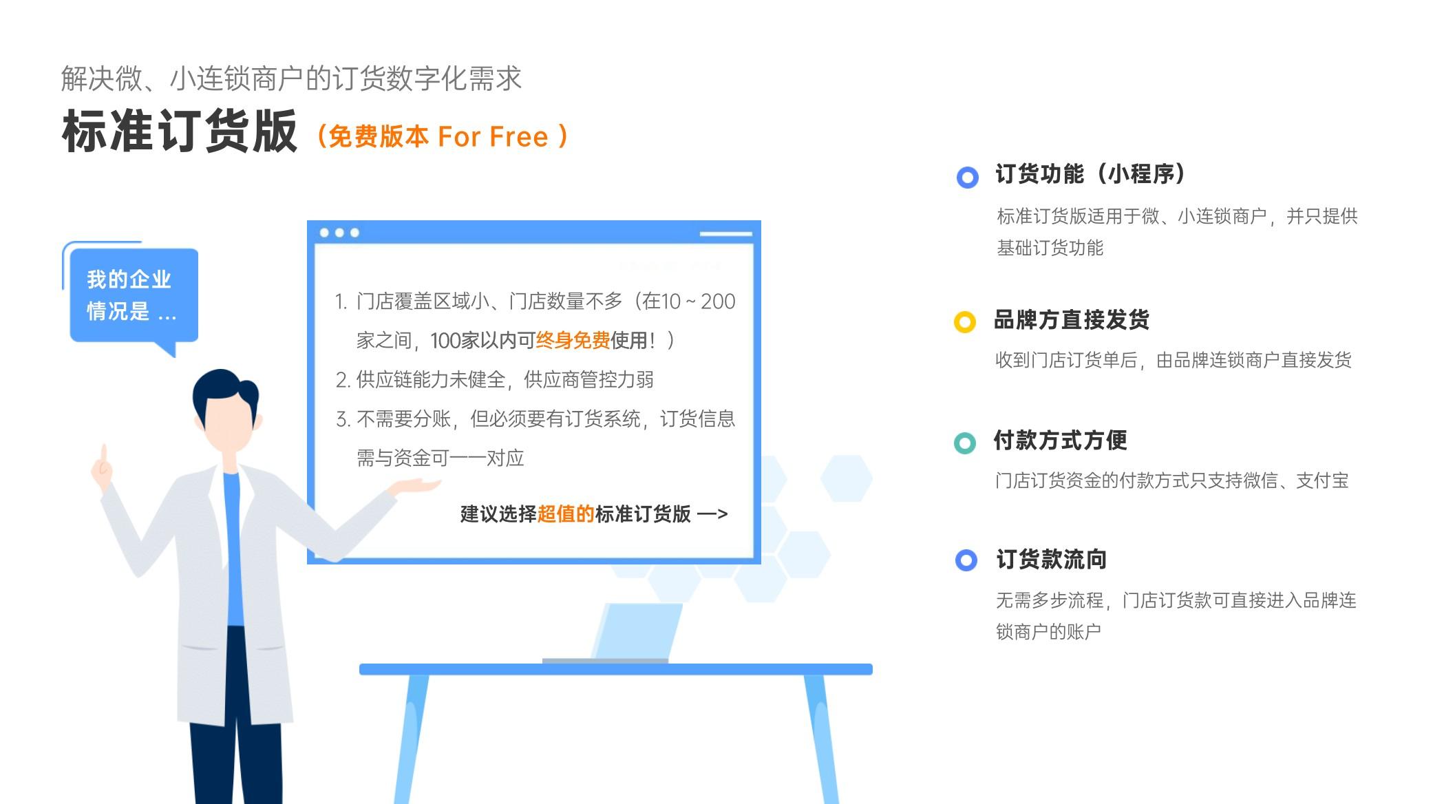 1、标准订货版(免费版本For free):解决微、小连锁商户的订货数字化需求。