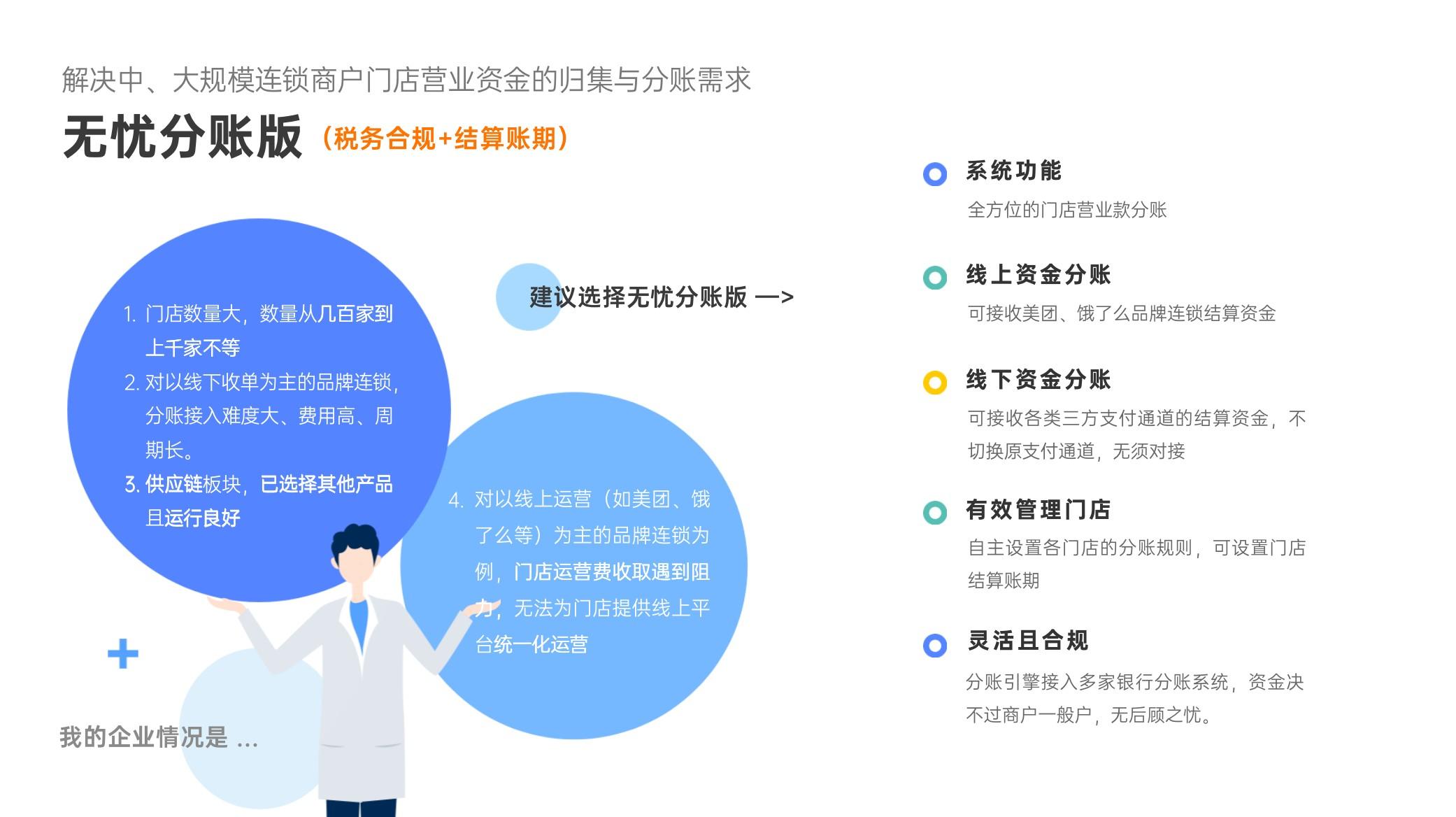 3、无忧分账版(税务合规+结算账期):解决中、大规模连锁商户门店营业资金的归集与分账需求。